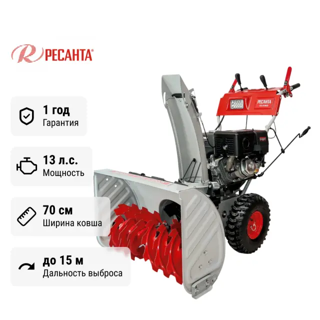 Бензиновый снегоуборщик Ресанта СБ 8100Э - это мощная и надежная техника, специально разработанная для эффективной очистки снега с больших площадей. Агрегат оснащен надежным двигателем мощностью 13 лошадиных сил, что позволяет ему легко справляться с глубоким снегом и толстым льдом.