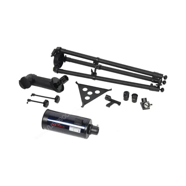 Высота металлического штатива-треноги регулируется от 72 см до 124 см за счет телескопической конструкции с винтовыми фиксаторами. Пластиковые опоры на ножках не позволяют штативу царапать поверхность пола. При использовании телескопа в "полевых" условиях пластиковые опоры выкручиваются вверх и штатив устанавливается на неровную поверхность на "шипах". Для точного выравнивания штатива сверху на корпусе размещен крупный пузырьковый уровень диаметром 25 мм, а для придания устойчивости крепится растяжка с лотком, служащая одновременно полочкой для окуляров.