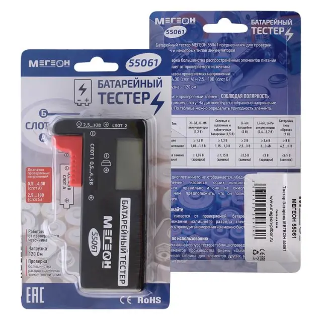 Технические характеристики Тестер батареек МЕГЕОН 55061