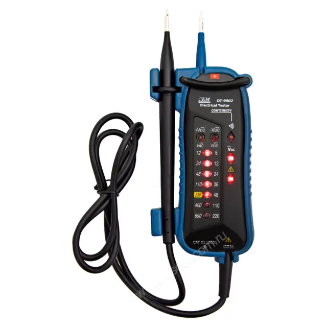 Тестер-пробник CEM DT-9902 — комбинированный измерительный прибор, предназначенный для проведения оперативных проверок и обслуживания бытовых, коммерческих и промышленных питающих электросетей. Тестер позволяет контролировать уровень напряжения в сетях переменного и постоянного тока, а также проверять целостность электрических цепей, наличие и надежность контактных соединений.