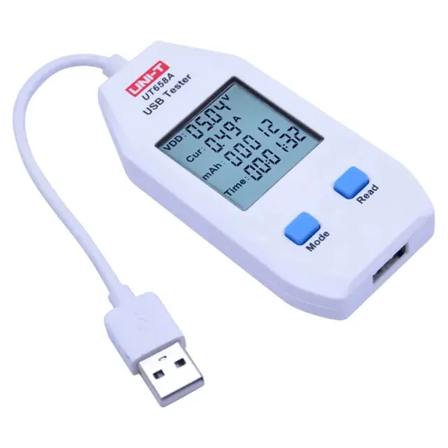 Тестер напряжения UNI-T UT658A служит для определения электрических параметров вторичных источников питания и устройств хранения энергии, а также преобразователей и потребителей, оснащенных USB портом. Соответствуя спецификации USB 2.0/3.0, для подключения к объектам контроля изделие оборудовано встроенным в корпус гнездом и штекером Type-A на гибком кабельном соединителе 10-сантиметровой длины. A-модификация относится к второму поколению своей серии и от базовой модели отличается конструкционным исполнением и расширенной функциональностью, обеспечивая возможность тестирования устройств с поддержкой протоколов быстрой зарядки не только QC 1.0, QC 2.0, но и QC 3.0.