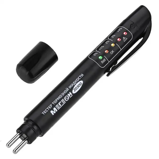 Тестер тормозной жидкости МЕГЕОН 20300 — это компактный и простой в использовании прибор для определения процента влаги в тормозной системе автомобиля. С помощью цветной светодиодной шкалы он мгновенно показывает уровень увлажнения: от "сухой, исправной" до "критически влажной, требующей замены". Это незаменимый инструмент как для автолюбителей, так и для профессиональных сервисов, где важна безопасность и профилактика отказов тормозной системы.