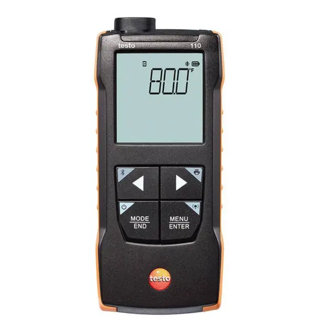 Термометр Testo 110 – обновленная версия прецизионного цифрового прибора, предназначенного для оперативного температурного контроля, снабженная функцией обмена данными со смартфоном/планшетом с приложением testo Smart App. Устройство обеспечивает выполнение измерений с использованием подключаемых датчиков Pt100 и NTC, от типа и вида которых зависят его функциональные возможности, и может использоваться не только для лабораторных и технических измерений, но и применяться в пищевой отрасли, что подтверждено сертификацией HACCP. Для выполнения измерений в сложных условиях доступен опциональный кожух-чехол TopSafe, повышающий класс пыле-влагозащиты изделия до IP65.