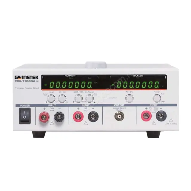 Токовый шунт GW Instek PCS-71000A - это комбинированное прецизионное устройство лабораторного назначения типа "три в одном". Помимо пяти встроенных мер сопротивления разных номиналов для токовых измерений от 30 мА до 300 А, прибор оснащен двумя встроенными измерителями с 6,5-разрядными индикаторами для контроля приложенного напряжения и силы протекающего тока.