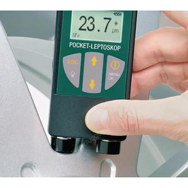 Настройка толщиномера POCKET-LEPTOMETER и вызов функций производятся через меню с помощью навигационных клавиш. Оборудование работат от сменной батареи, позволяющей выполнять измерения в течение 70 часов.