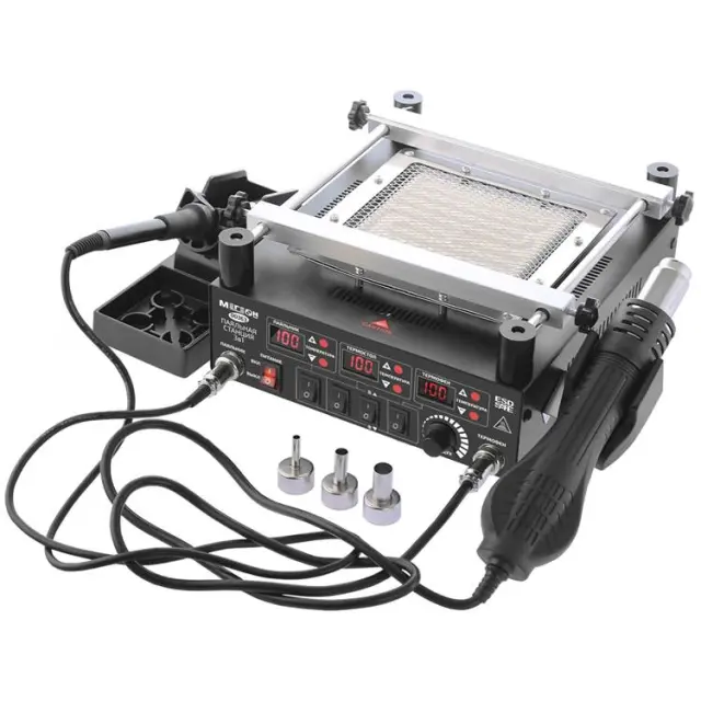 В комплекте идут три различных наконечника для термофена. Это позволяет использовать его для различных задач, таких как разогрев, сушка или даже удаление старого припоя. Универсальность этого инструмента делает его идеальным выбором как для профессионалов, так и для любителей.
