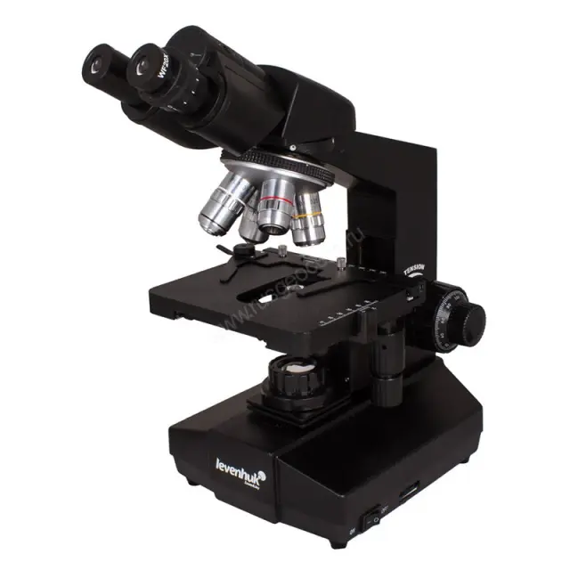 Лабораторный микроскоп Levenhuk 850B - это оптический прибор высокого класса, главное преимущество которого заключено в 4 планахроматических объективах и схеме освещения по Келлеру. Применение план-объективов позволяет получить увеличенное до 2000 крат изображение без хроматических и сферических аберраций. Эта модель используется для решения сложных клинических и лабораторных задач, при выполнении научных исследований, проведении экспертиз и т.п. Прибор особо востребован при проведении гематологических и цитологических анализов по методу темного поля, а также при диагностике с использованием окрашивающих препаратов.