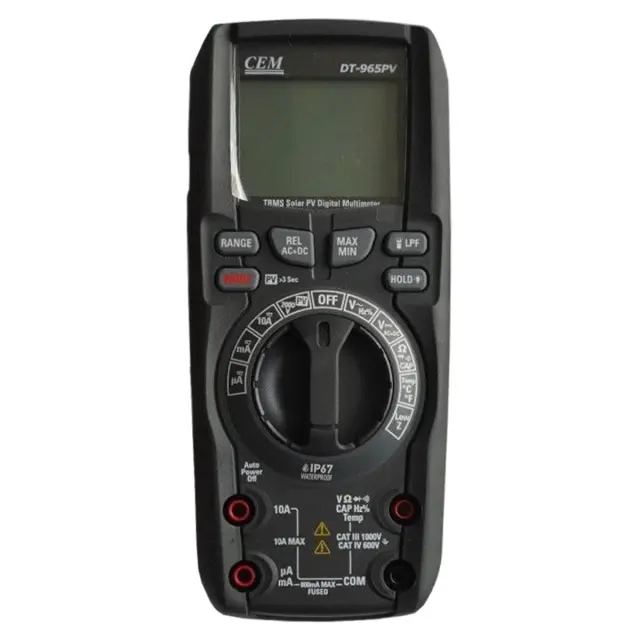 CEM DT-965PV — это цифровой мультиметр, разработанный специально для диагностики и наладки фотоэлектрических систем. Он позволяет измерять напряжение, ток, мощность постоянного тока, а также параметры солнечных панелей: напряжение холостого хода (Voc), ток короткого замыкания (Isc), напряжение и ток в точке максимальной мощности (Vmp, Imp), а также саму максимальную мощность (Pmax). Это делает его незаменимым инструментом для монтажников, инженеров и техников, работающих с солнечными электростанциями.