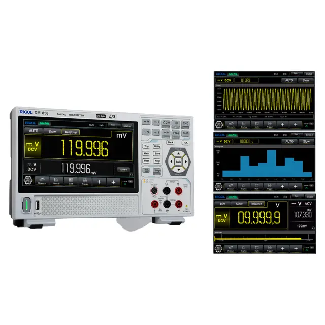 Цифровой мультиметр RIGOL DM858E является бюджетной версией многофункционального лабораторного измерителя 800-серии, у которой сохранены все основные функции, но с целью снижения цены несколько сокращен объем памяти, понижена максимальная скорость считывания показаний, а также ограничены верхние пределы диапазонов измерения силы тока и емкости. Как и базовая модель, прибор реализует 11 типов электрических измерений с разными вариантами запуска, с отображением результатов в виде цифровых показаний с 5,5-разрядностью и в графическом представлении, и 5 математических функций, включая автоматический сбор статистики, что исключает необходимость задействования дополнительных внешних средств для анализа данных. Устройство настольного типа выполнено в плоском корпусе и поддерживает возможность крепления на кронштейне к стене или другой вертикальной поверхности для экономии пространства на рабочем месте.