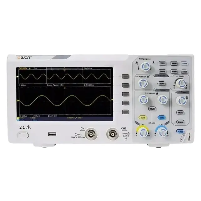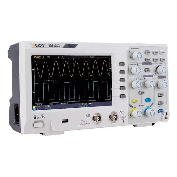 Цифровой осциллограф OWON SDS1202 является старшей моделью в линейке бюджетных лабораторных приборов эконом-класса, обладая наибольшей полосой пропускания и лучшим показателем частоты дискретизации, что обеспечивает возможность исследования формы сигналов в полосе частот до 200 МГц, с временем нарастания от 1,7 нс. Изделие оснащено двумя входными каналами и характеризуется компактными размерами и небольшим весом, благодаря чему не загромождает рабочее место, а также является подходящим вариантом для использования в ходе диагностических работ на выезде.