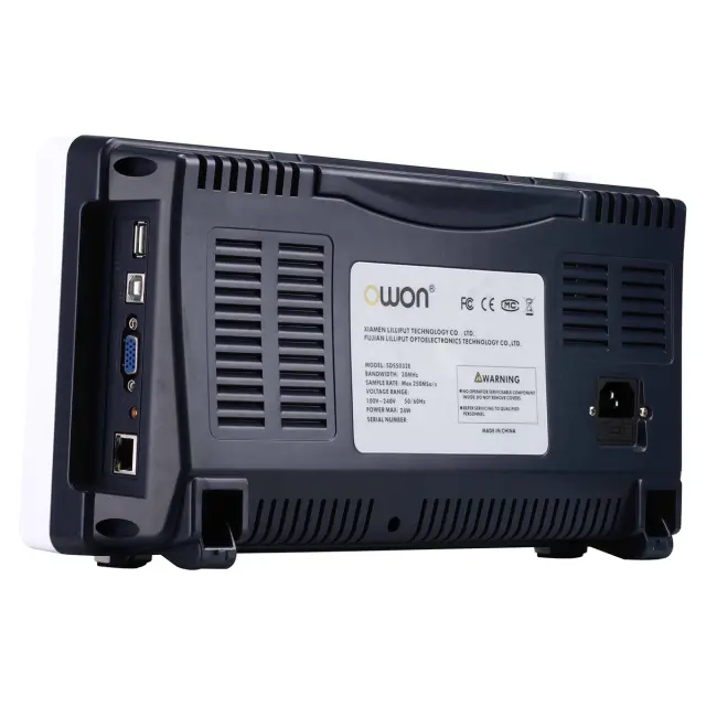 Цифровой осциллограф OWON SDS5032EV обладает полосой пропускания 30 МГц, а также поддерживает запись осциллограмм длиной до 10 000 точек, с возможностью их последующего воспроизведения. Прибор второго поколения характеризуется улучшенной точностью воспроизведения сложных сигналов за счет повышенной частоты дискретизации. В отличие от базовой модификации, V-версия дополнительно оснащается VGA-интерфейсом, реализуя возможность подключения внешнего монитора с большим экраном, что позволяет использовать цифровой осциллограф для демонстрационных и обучающих задач.