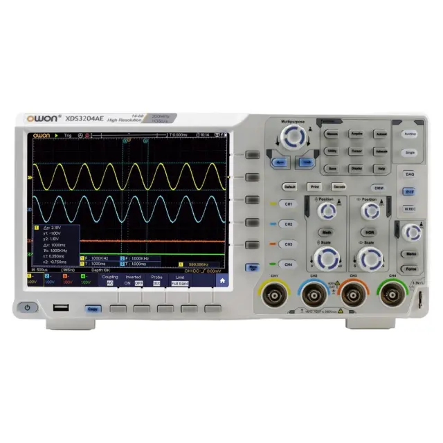 С полосой пропускания в 200 МГц и 14-битным аналого-цифровым преобразователем , OWON XDS3204AE обеспечивает высокое качество отображения сигналов. Эти характеристики позволяют работать с широким спектром сигналов, от низкочастотных до высокочастотных, что делает осциллограф универсальным инструментом для различных приложений.