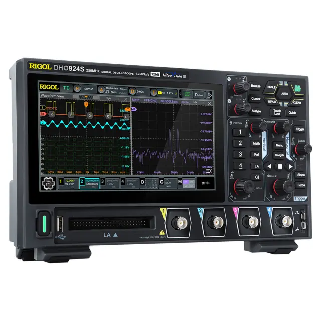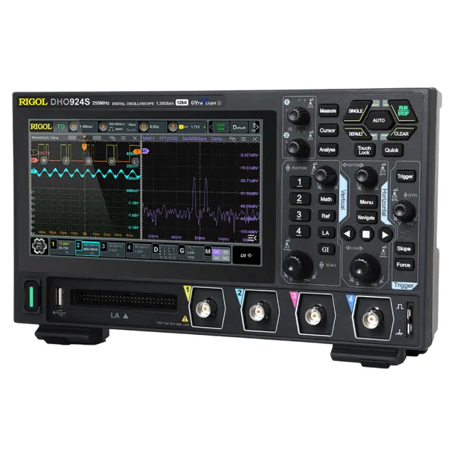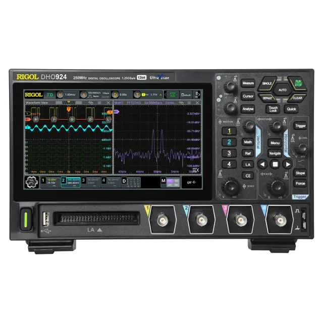 Подобно более дорогим изделиям, цифровой осциллограф RIGOL DHO924 оборудуется сенсорным дисплеем, помимо кнопок управления и поворотно-нажимных регуляторов. За счет этого обеспечивается гибкость и наглядность при обращении с прибором. Внутренняя память при объединении каналов обеспечивает запись осциллограмм длиной до 50M точек. Поддержка режима цифрового люминофора с настраиваемым временем затухания и 256-уровневой градацией интенсивности упрощает выявление редких аномалий сигнала. Окна с разными функциями можно выводить на экран одновременно, отслеживая взаимосвязь различных параметров. Для повышения точности измерений при контроле характеристик сигнала в цифровом осциллографе предусмотрен встроенный 4-разрядный вольтметр и частотомер.