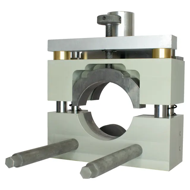 Для исключения люфтов подвижной части приспособления относительно неподвижной и обеспечения параллельности рабочих поверхностей рамочная конструкция оборудована 4 направляющими. Фиксация цилиндрического образца производится с помощью винтового зажима. Возвращение верхней части изделия в исходное положение после испытаний обеспечивает пружинный механизм.