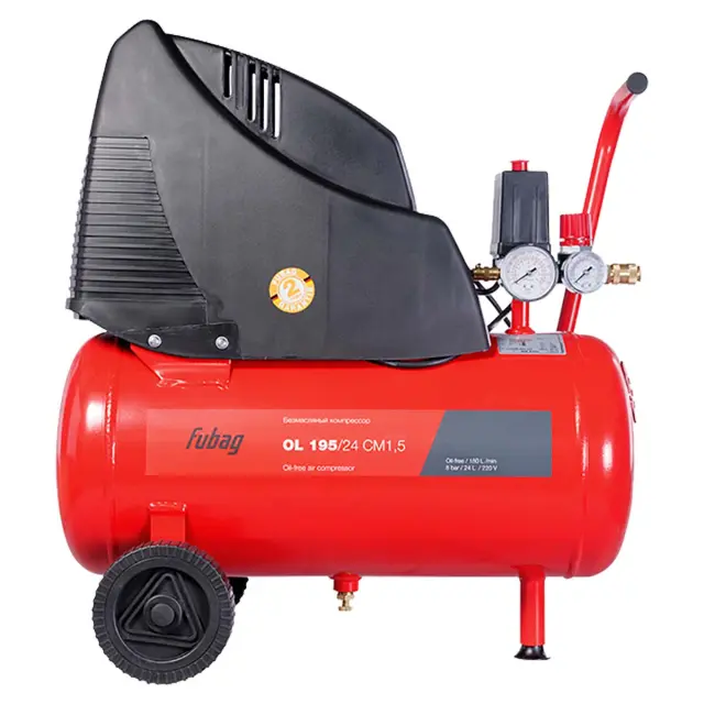 Электрический двигатель оснащен защитой от перегрева и автоматическим повторным пуском, что гарантирует надежную работу и предотвращает возможные поломки. Пластиковый кожух блока компрессорной головки и двигателя компрессора Fubag OL 195/24 CM1,5 обеспечивает защиту от пыли, грязи и влаги, что способствует продолжительной и бесперебойной работе устройства.